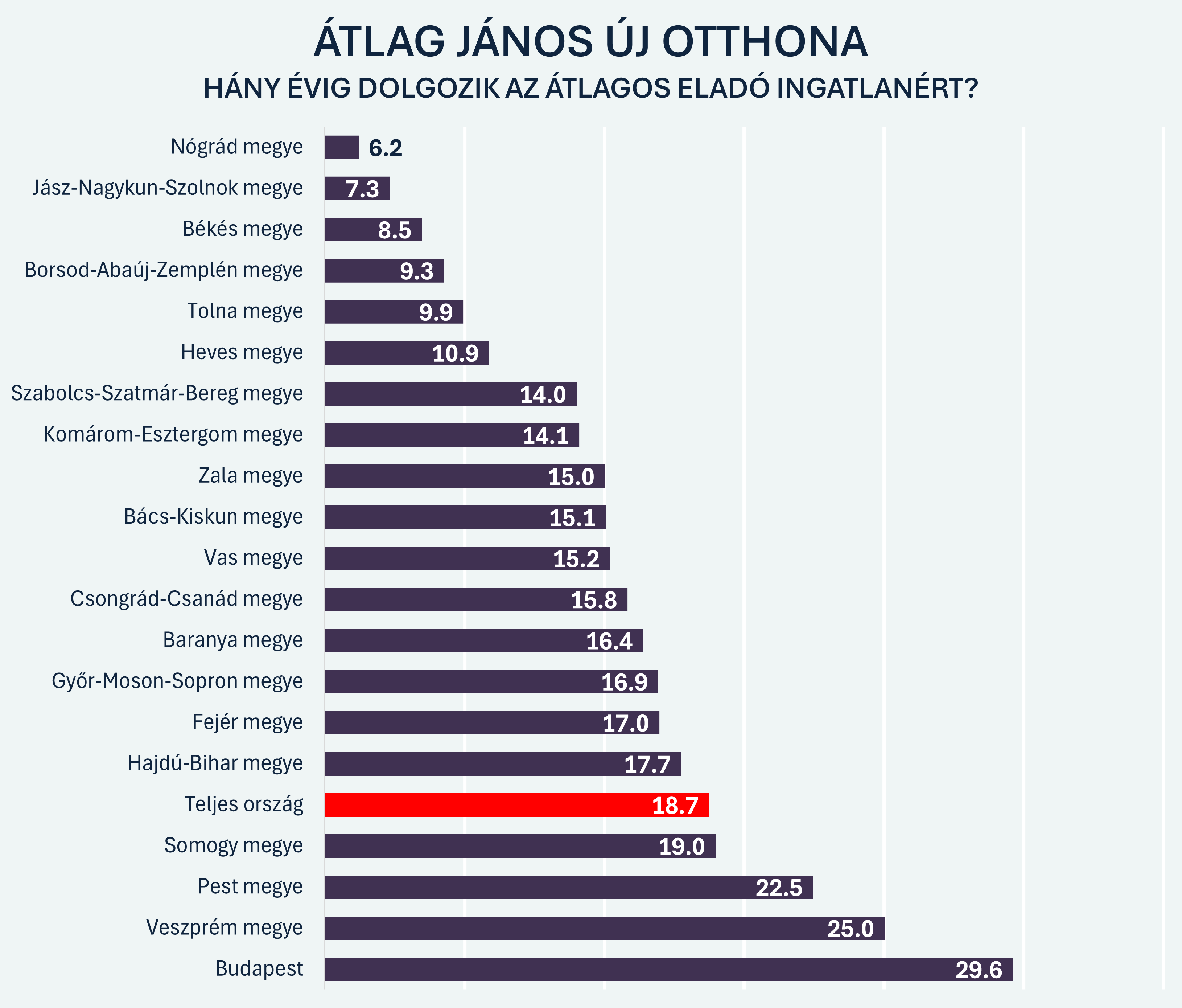 Átlag János az a képzeletbeli barátunk, aki az aktuális nettó mediánkeresetet, vagyis havi 397 400 forintot visz haza. Nem kiemelkedően jól keres, de nem is a sor végén áll. Ő a pontosan „középen lévő” munkavállaló: a magyarok fele kevesebbet, fele többet keres nála. Az ő helyzetén keresztül jól megfogható, hogy a mostani árak mit jelentenek a mindennapok szintjén.Jánosunknak országos átlagban közel 19 évnyi teljes nettó jövedelmét kellene félretennie ahhoz, hogy megvásároljon egy átlagos eladó lakást. Budapesten ez az időtáv közel 30 évre nyúlik. És ez még egy erősen leegyszerűsített, „tankönyvi” helyzet: nem számol megélhetési költségekkel, adókkal, váratlan kiadásokkal, vagyis azzal, hogy közben ennie-laknia-élnie is kell.