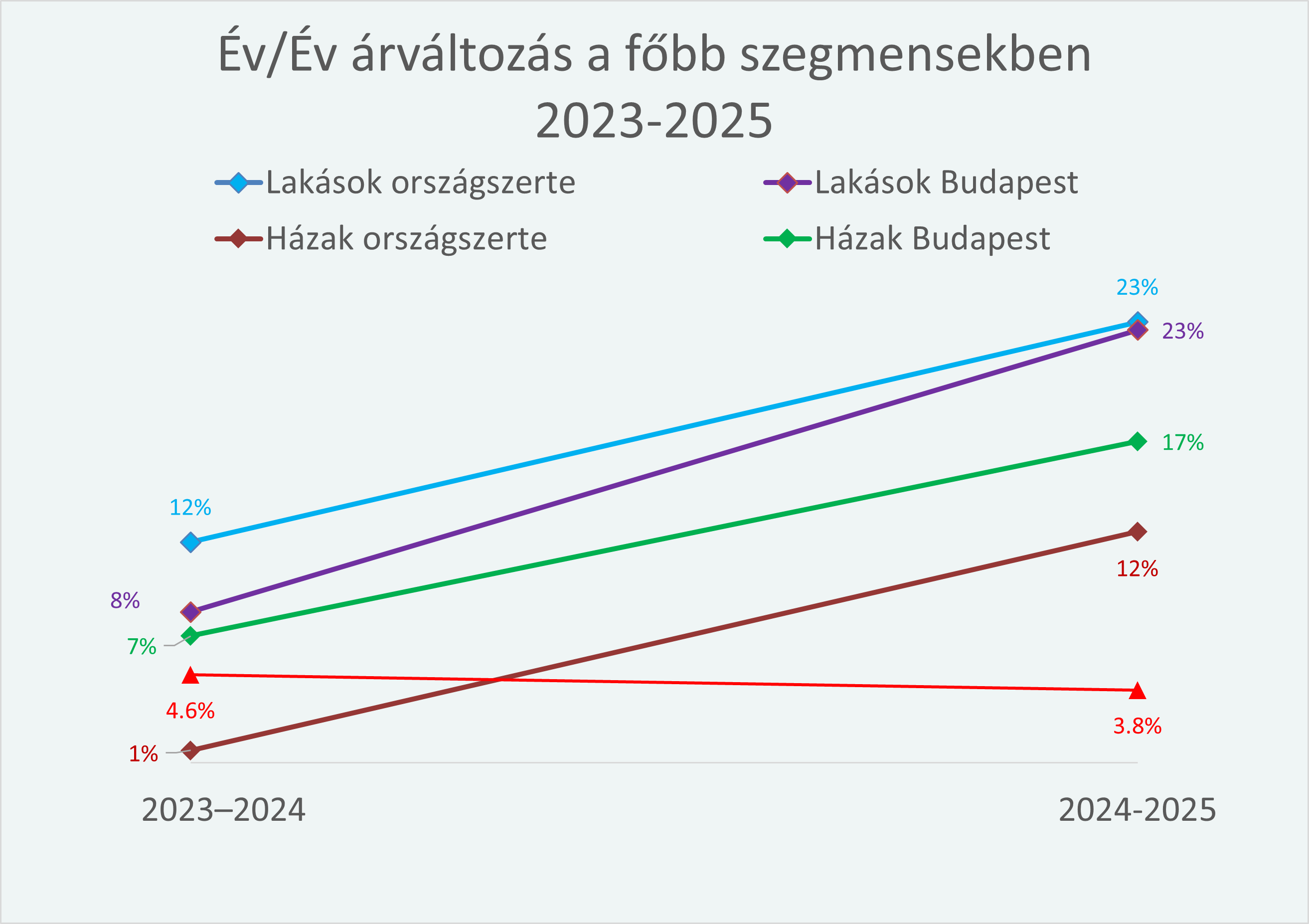 Ez a helyzet 2024–2025-re egyértelműen megváltozott. Az idei adatok alapján már minden vizsgált szegmensben – lakásoknál és házaknál, országosan és Budapesten egyaránt – az áremelkedés többszörösen meghaladta az éves inflációt. A váltás különösen jól érzékelhető a házak piacán.