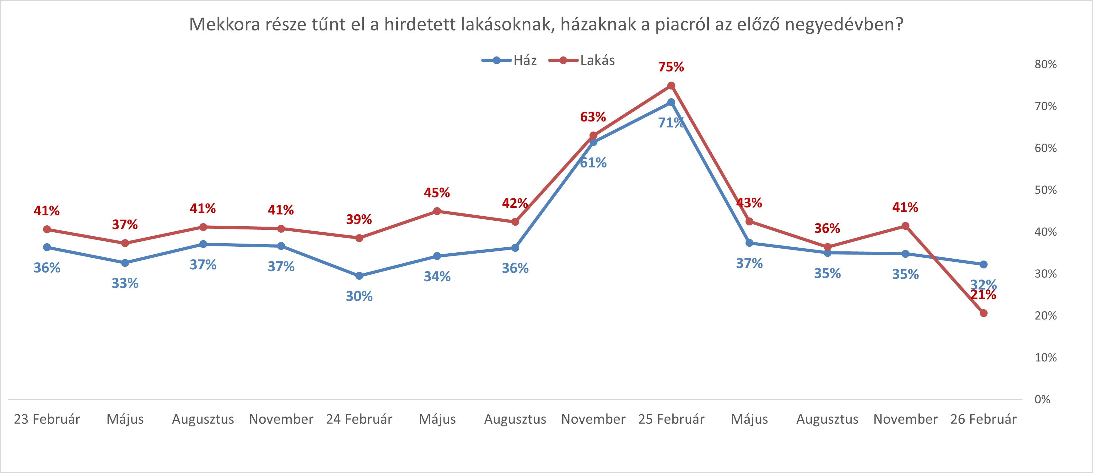 2023 elejétől 2024 nyaráig viszonylag stabil képet látunk. A lakásoknál jellemzően 37-45 százalék, a házaknál 30-37 százalék között mozgott ez az arány. Vagyis nagyjából minden harmadik-negyedik ingatlan eltűnt a piacról egy negyedéven belül.