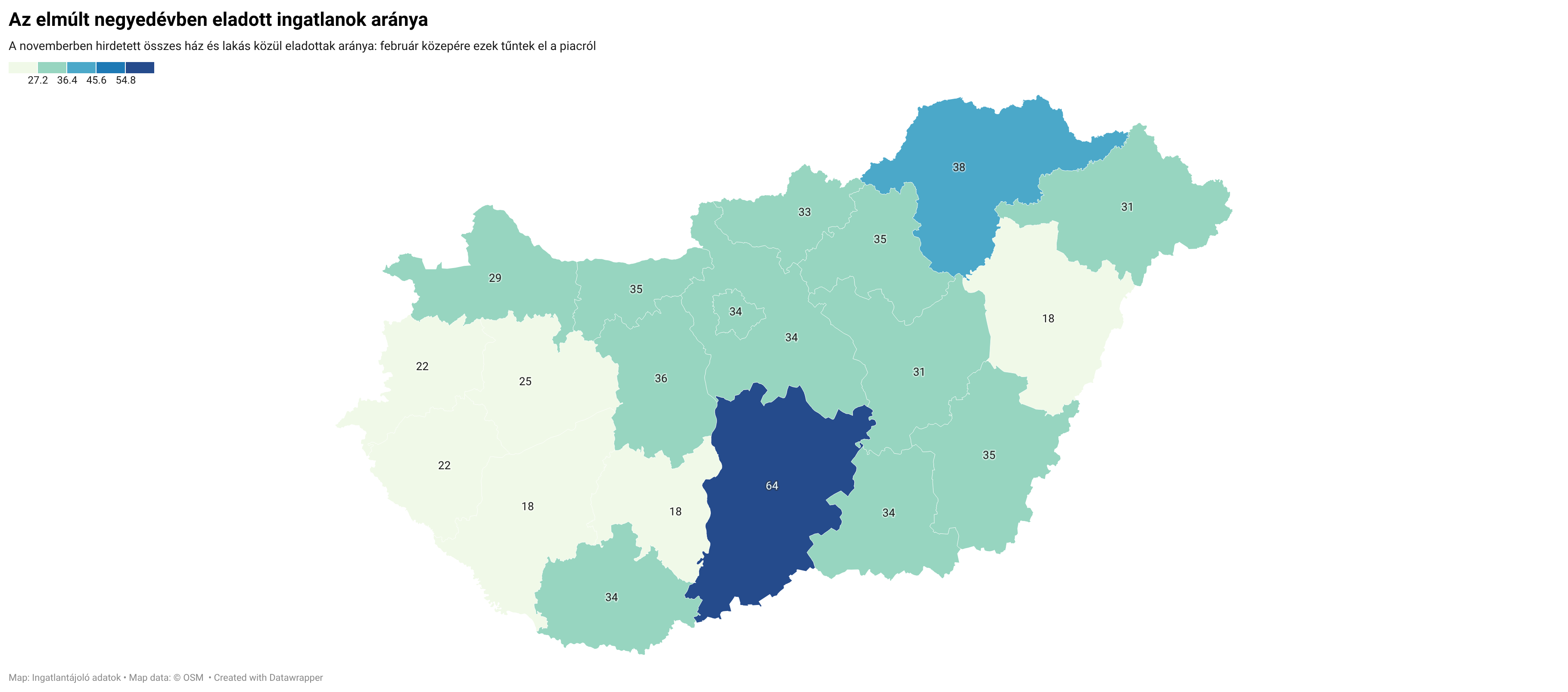 A Dunántúl ugyanakkor szinte egységesen gyengélkedik. Több nyugati és délnyugati megyében (és Hajdú-Biharban) 20 százalék alatti az arány, ami kifejezetten alacsony forgási sebességet jelent. Ezeken a területeken valóban alátámasztják a számok a „nem köttetnek üzletek” érzést.